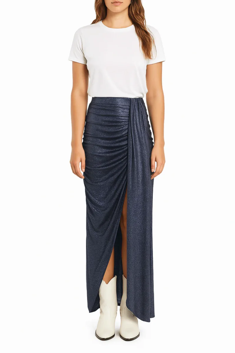 Parte della scintillante Stardust Collection, la gonna lunga AMANDA in lurex blu è un capo Made in Italy che unisce glamour e raffinatezza. La vita alta drappeggiata e l’elegante spacco creano una silhouette femminile e seducente.
